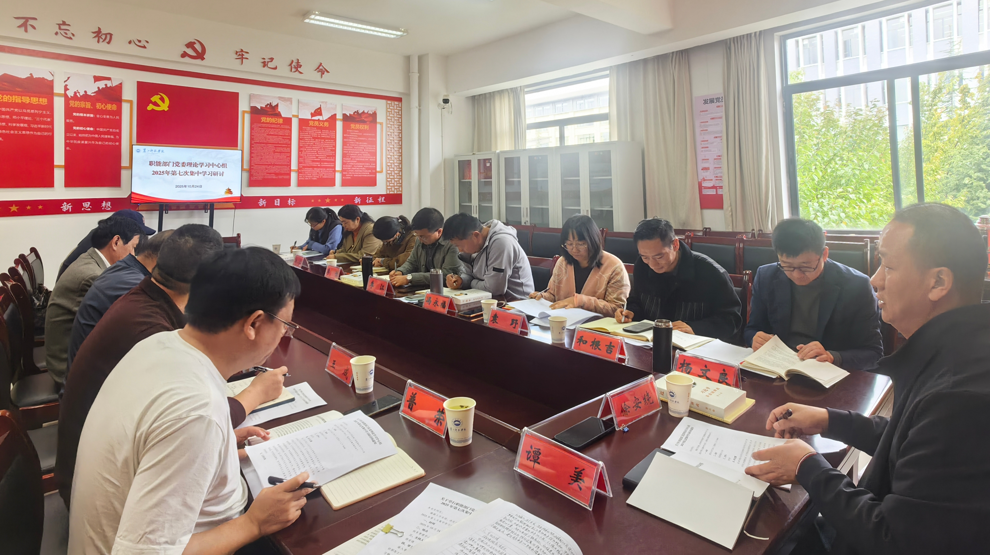 2025年10月24日,职能部门党委理论学习中心组举行2025年第7次集中学习研讨,深入学习领会习近平文化思想和习近平总书记关于意识形态工作的重要论述、关于网络安全的重要论述、习近平总书记关于做好新时代党的统一战线工作的重要思想、关于加强和改进民族工作的重要思想、关于宗教工作的重要论述,牢牢掌握意识形态工作领导权,做好做细做实新时代党的统一战线和民族宗教工作,推动中华民族共同体建设,深入学习领会习近平生态文明思想,推进绿美校园、节约型校园建设,努力服务长江上游重要生态安全屏障建设。